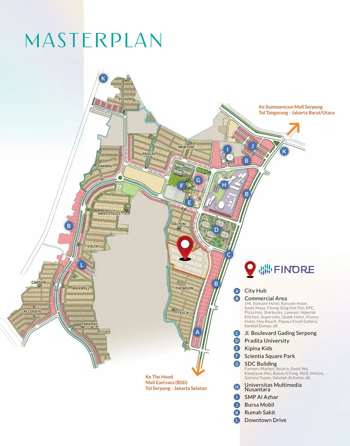 Lokasi strategis cluster Finore Summarecon Serpong dimana berada di jantung kota mandiri Gading Serpong, Tangerang. Depan universitas Pradita, berdekatan dengan Universitas Multimedia Nusantara (UMN) dan kawasan Scientia Garden. Posisi rumah yang sangat premium dekat dengan berbagai fasilitas pendukung yang sangat lengkap seperti Summarecon Mall Serpong (SMS), Pasar Modern Paramount, Sekolah, Rumah Sakit dan lainnya.